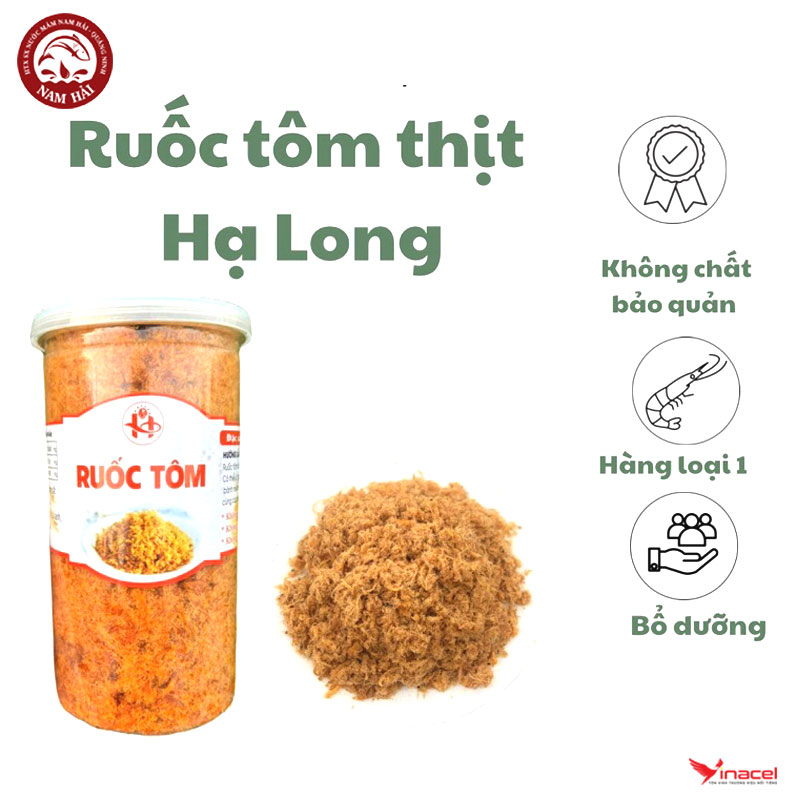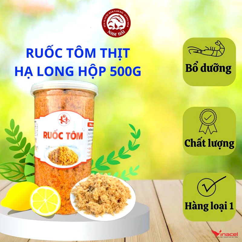 Ruốc tôm thịt Hạ Long không khô như ruốc thịt truyền thống, dễ ăn, "tốn cơm" hơn. Ngoài ra có thêm tôm sắt biển nên ngon, ngọt thịt và bổ sung nhiều canxi, đặc biệt tốt cho trẻ em và người lớn tuổi. Khi đi du lịch xa cứ thủ sẵn 1 lọ ruốc tôm thịt đảm bảo ko lo đói hoặc cho các bé khảnh ăn ko hợp khẩu vị.