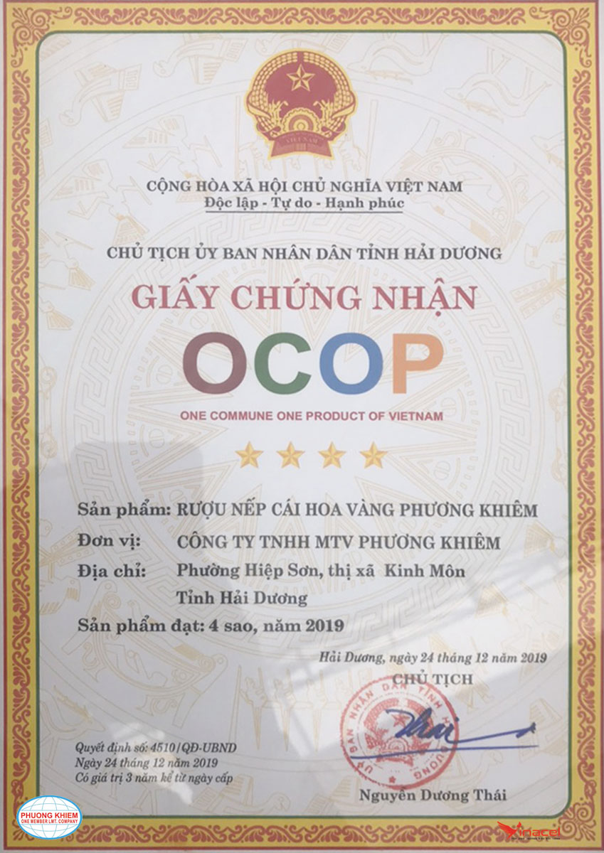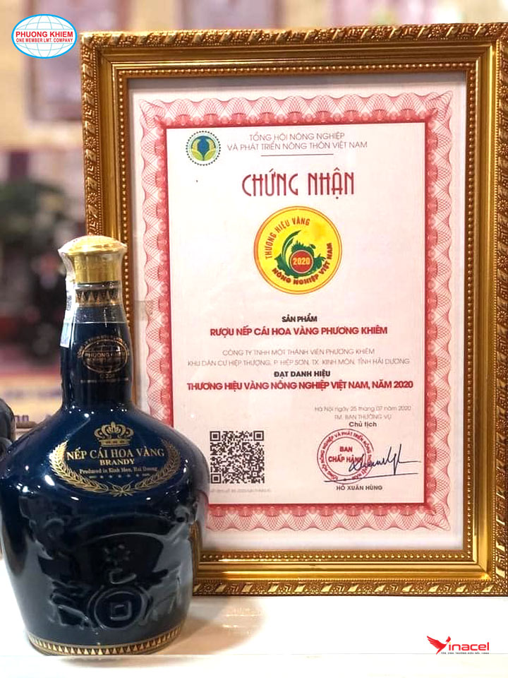 Rượu nếp cái hoa vàng Phương Khiêm vinh dự được nhận Danh hiệu “Thương hiệu vàng” tư Tổng hội nông nghiệp và phát triển nông thôn Việt Nam; Đạt sản phẩm OCOP 4 sao cấp tỉnh năm 2019.