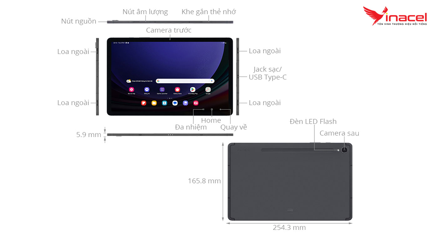 Về kích thước, chiếc tablet này có màn hình rộng lớn giúp tận hưởng trải nghiệm giải trí và làm việc một cách thoải mái. Bên cạnh đó, độ mỏng 5.9 mm của máy cũng làm cho việc cầm nắm và sử dụng dễ dàng, phù hợp với nhu cầu di động của người dùng.