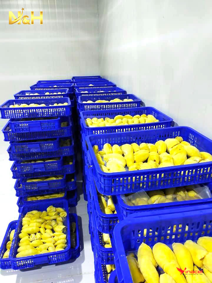Sau khi bọc túi PE hút chân không sầu riêng sẽ được cấp đông âm sâu 40 độ đảm bảo tiêu chuẩn IQF. Thời gian đông lạnh sầu riêng tươi càng nhanh thì sẽ giúp sầu riêng đông lạnh giữ được chất lượng tốt nhất
