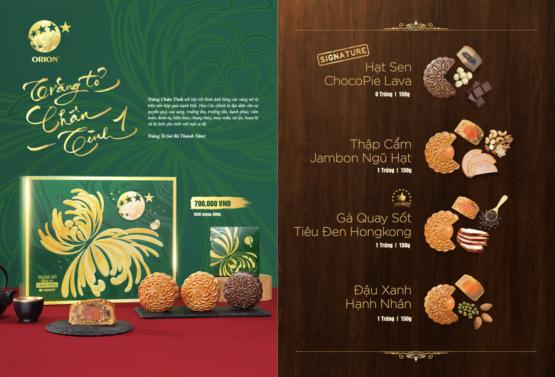 Xuất phát từ sự cảm mến văn hóa Việt Nam, Orion đã lên kế hoạch phát triển sản phẩm bánh Trung Thu. Bộ sản phẩm bánh Trung Thu của Orion mang trong mình dấu ấn của sự ‘Chân Tình’. Sản phẩm tập trung chăm chút tỉ mỉ về mặt chất lượng bánh từ việc lựa chọn nguyên liệu cho tới tạo hình, đóng gói, thiết kế bao bì, thành phẩm.