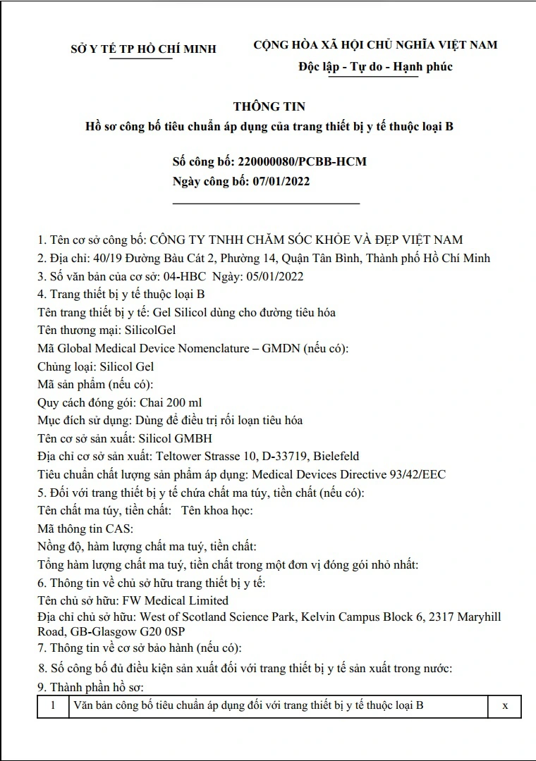 • 3,5g Silicon dioxide trong 100ml acid Silicic gel.