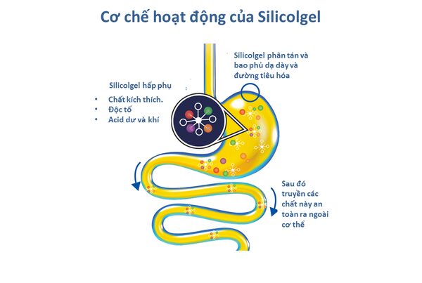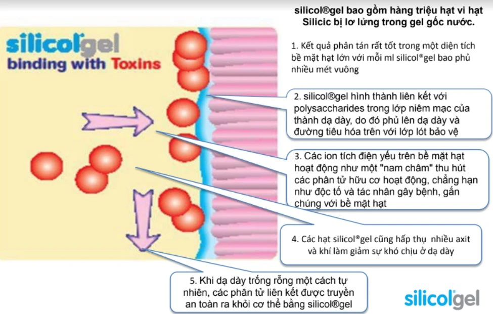 • Sau khi vào niêm mạc sẽ phân tán lên bề mặt với diện tích lớn, Silicol Gel liên kết với Polysaccharide trong niêm mạc, hình thành một lớp keo bao phủ quanh niêm mạc, giúp làm dịu và bảo vệ niêm mạc dạ dày và ruột.