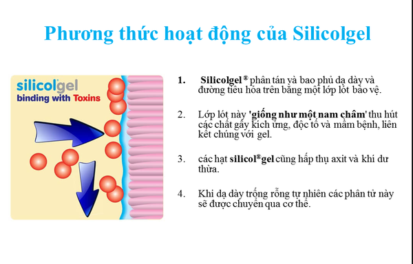• Các hạt Silicol Gel cũng hấp thụ nhiều axit và khí làm giảm sự khó chịu ở dạ dày