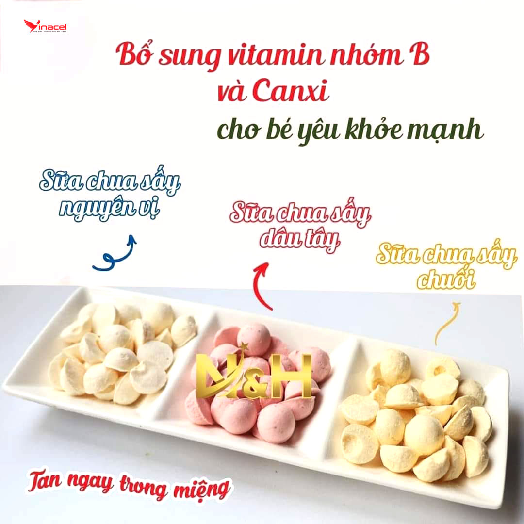 • Sữa chua sấy được kết hợp rất nhiều vị từ trái cây như dâu, táo, chuối,.. rất dinh dưỡng và dễ ăn. Để chọn loại hợp khẩu vị bé nhất, mẹ có thể cho con thử từng loại trước và quan sát bé thích ăn hương vị nào nhất để giúp con ăn ngon miệng và kích thích sự thèm ăn của con.