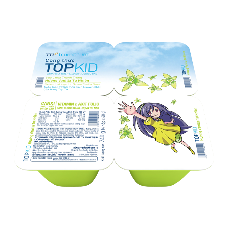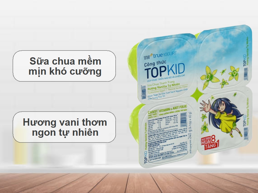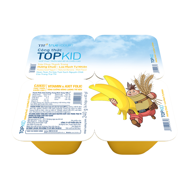 Sản phẩm sữa chua ăn làm từ sữa tươi sạch nguyên chất được lên men tự nhiên và qua công nghệ thanh trùng giúp lưu giữ hầu như trọn vẹn dưỡng chất từ sữa và kéo dài thời gian sử dụng. Sản phẩm bổ sung vi chất trong công thức TOPKID (Canxi, Vitamin B6, B12 và axit Folic) giúp hỗ trợ tối ưu phát triển chiều cao và năng lượng trí não cho trẻ. Sản phẩm gồm 3 hương vị độc đáo ngon mê tít: Sô cô la Nguyên Chất lần đầu tiên có mặt tại Việt Nam, Vanilla ngọt ngào và hương vị kết hợp sáng tạo Chuối- Lúa Mạch tự nhiên.