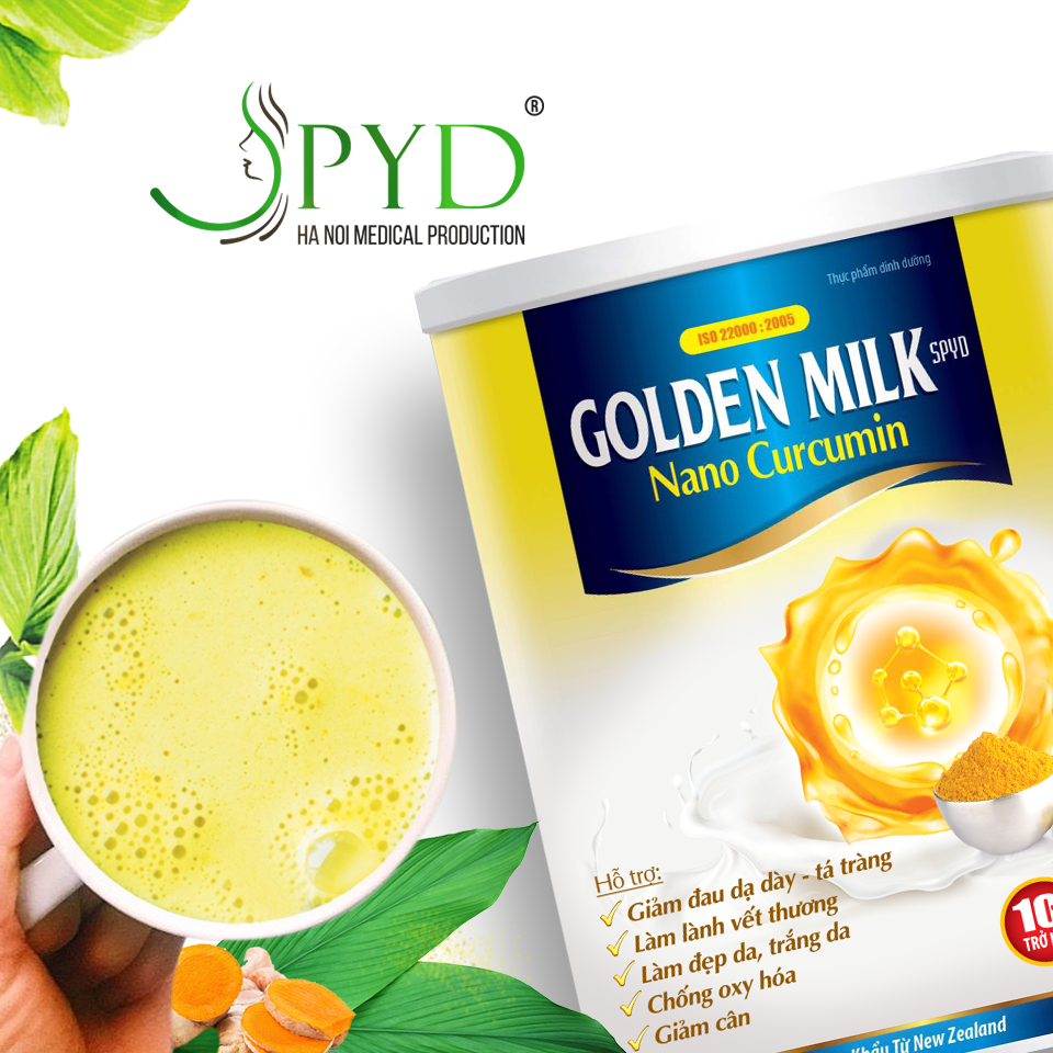 Golden Milk SPYD là sản phẩm sữa gầy được bổ sung Nano Curcumin (Tinh nghệ Nano), dạng bào chế công nghệ cao của Curcumin chiết xuất từ nghệ vàng. Kích thước Nano siêu nhỏ giúp Nano Curcumin thẩm thấu vào máu nhanh chóng để phát huy hiệu quả hỗ trợ điều trị tại hầu hết các cơ quan khác nhau trong cơ thể. Độ hấp thu của Nano Curcumin đạt tới 95%, tăng khả năng trị liệu lên nhiều lần so với Curcumin thông thường, giúp nhanh lành vết thương (bao gồm các vết thương sau phẫu thuật, viêm loét dạ dày, tá tràng), ngăn ngừa lão hóa, tái tạo tế bào da, giảm thâm nám. Golden Milk SPYD còn cung cấp Collagen và các Vitamin có trong sữa giúp chống oxy hóa, làm đẹp da.