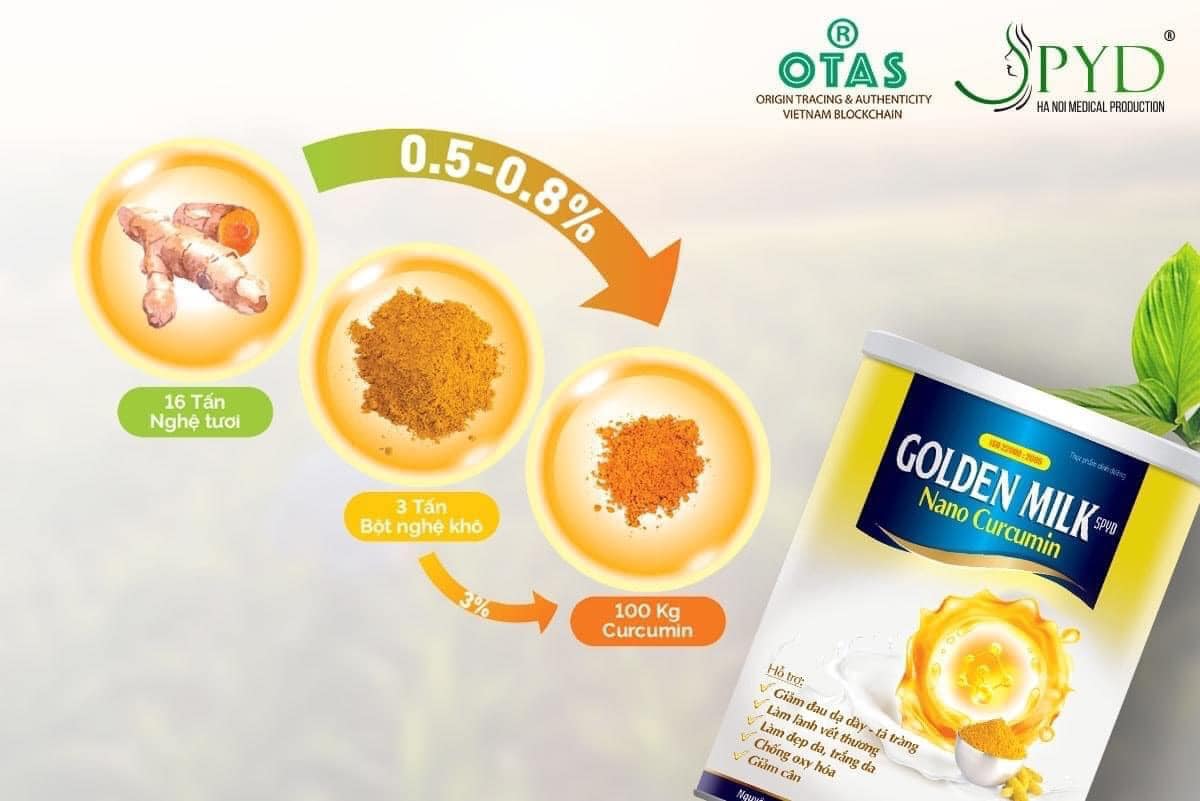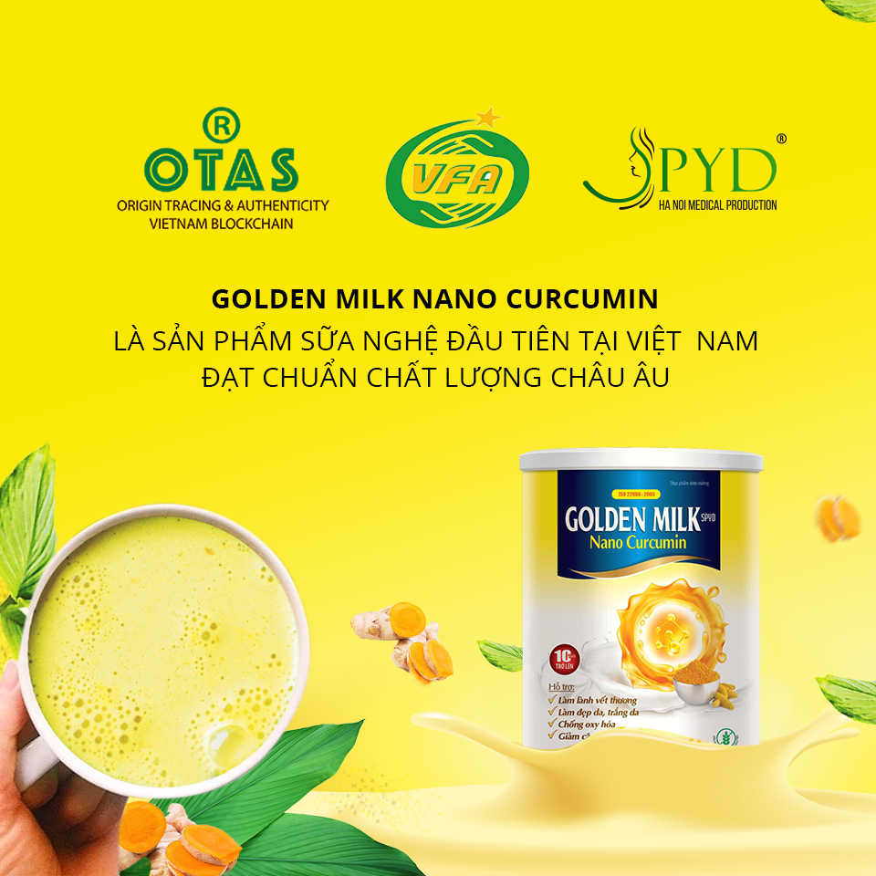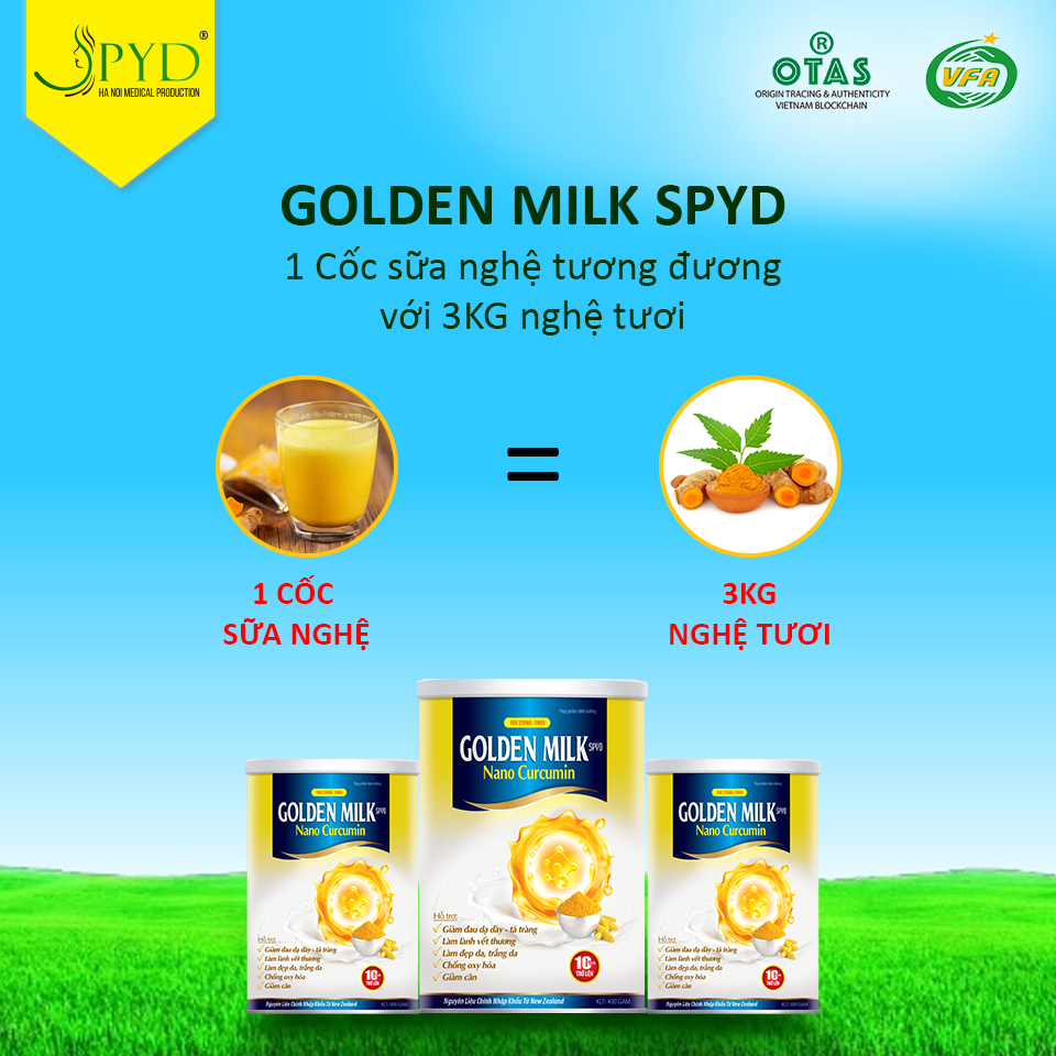 Sản phẩm được giám sát, xác thực, truy xuất nguồn gốc từ vùng trồng nghệ cho đến quá trình sản xuất, đóng gói sản phẩm Golden Milk Nano Curcumin theo Tiêu chuẩn/Hệ thống OTAS, được các thị trường Hoa Kỳ, EU, Nhật Bản, Australia công nhận. Độ hấp thu của Nano Curcumin đạt tới 95%, tăng khả năng trị liệu lên nhiều lần so với Curcumin thông thường, giúp nhanh lành vết thương như các vết thương sau phẫu thuật, viêm loét dạ dày, tá tràng; hỗ trợ ngăn ngừa lão hóa, tái tạo tế bào da, giảm thâm nám. Golden Milk SPYD còn cung cấp Collagen và các Vitamin có trong sữa hỗ trợ chống oxy hóa, làm đẹp da.Phụ nữ sau sinh thường ăn các loại thực phẩm giàu dinh dưỡng và bổ sung củ nghệ giã, bột nghệ... một cách truyền thống, nhưng thực tế sự hấp thu không đáng kể.