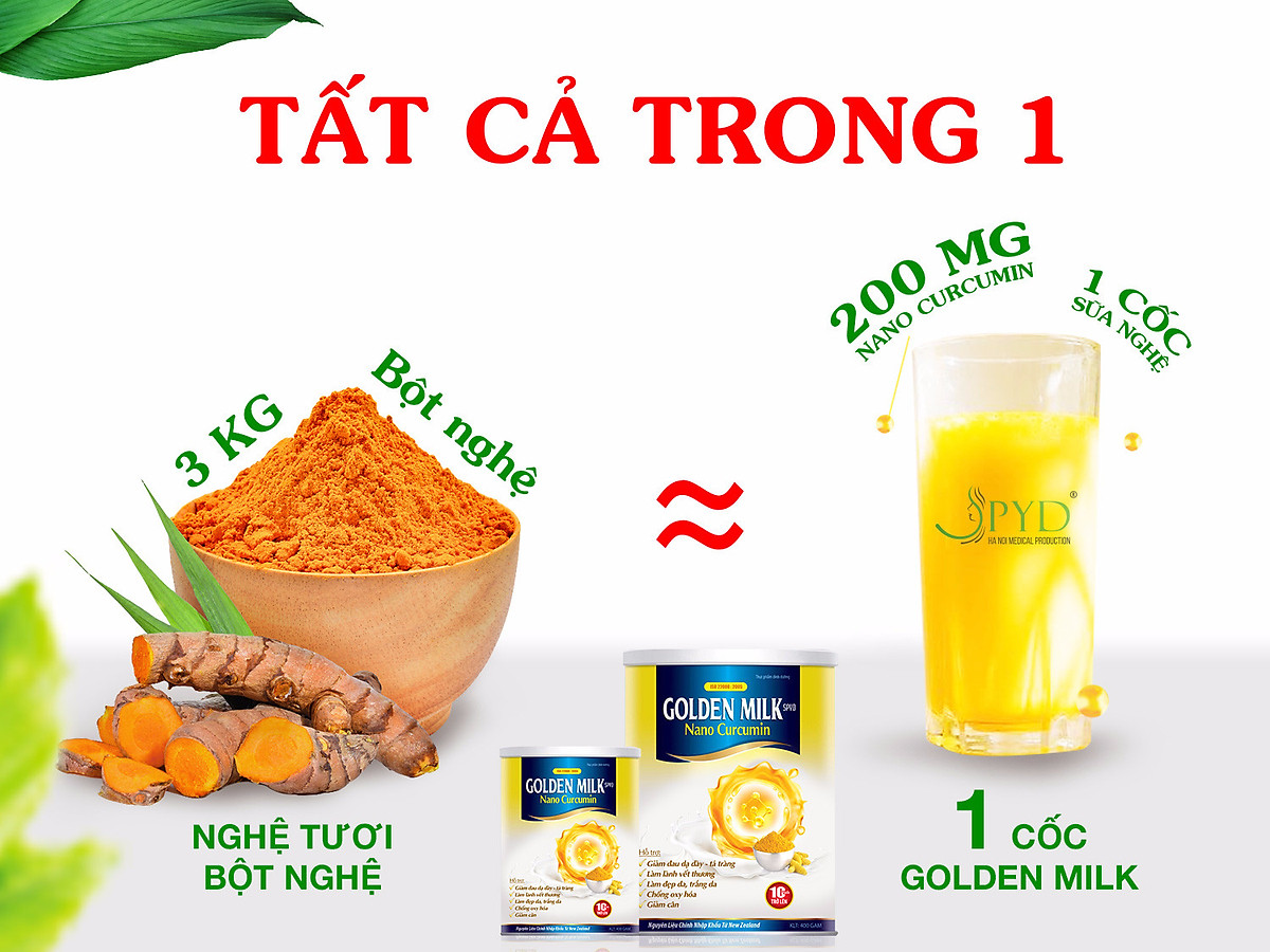 Hiện nay, trên thị trường có nhiều sản phẩm dinh dưỡng có chứa curcumin, nhưng sữa Golden Milk SPYD đang được ưa chuộng bởi hàm lượng Curcumin chứa trong đó.. Lượng Curcumin ở dạng nano trong 1 cốc sữa Golden Milk SPYD tương đương với lượng curcumin có trong 3 kg nghệ tươi. Với kích thước siêu nhỏ (100 nanômét - 1/1tỷ mét) tăng độ tan lên tới 7500 lần so với curcumin ở dạng thông thường (curcumin thông thường độ tan trong nước rất thấp: 0,0004mg/ml ở pH 7,3); đáp ứng và vượt qua những tiêu chuẩn về chất lượng của một số nước như Ấn Độ, Hàn Quốc, EU và Mỹ.