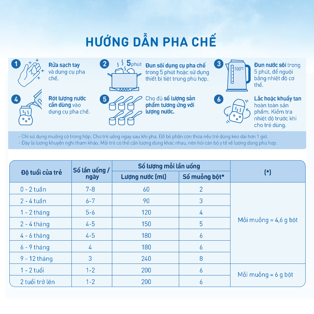 - Chỉ sử dụng muỗng có trong hộp. Cho trẻ uống ngay sau khi pha. Đổ bỏ phần còn thừa nếu trẻ dùng kéo dài hơn 1 giờ. Đây chỉ là lượng khuyến nghị tham khảo. Mỗi trẻ có thể cần lượng dùng khác nhau, nên hỏi cán bộ y tế về lượng dùng phù hợp.