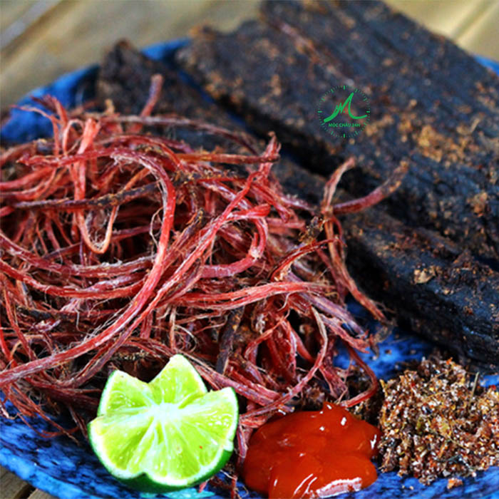 Thịt bò khô hay thịt bò gác bếp được chế biến hoàn toàn theo cách thủ công. Những con bò to, khỏe được lựa chọn để làm thịt khô. Khi ăn, nhai kỹ bạn sẽ nhận ra mùi vị thơm ngon vô cùng đặc biệt mà chỉ có thịt bò khô vùng Mộc Châu mới có được. Đó là mùi thơm ngon của gia vị nơi núi rừng ở bên ngoài quyện với vị ngọt đậm của thớ thịt bên trong sẽ cho người thưởng thức cảm giác như đang được phiêu lưu trong hương sắc bản mường nơi núi cao mời gọi.