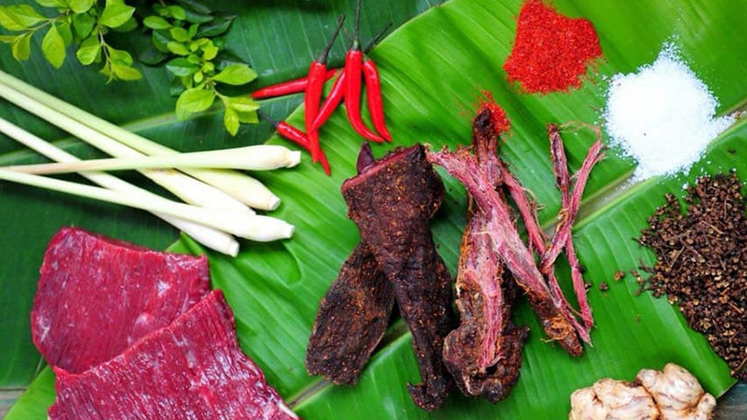 Sau khi có được phần thịt bắp của bò, người ta cắt khúc dày 5cm, dài khoảng 20cm để chuẩn bị làm đặc sản kể trên. Thịt được tẩm ướp với hỗn hợp gia vị gồm: Ớt, Tỏi, Nước mắm, hạt tiêu, Mắc khén,….