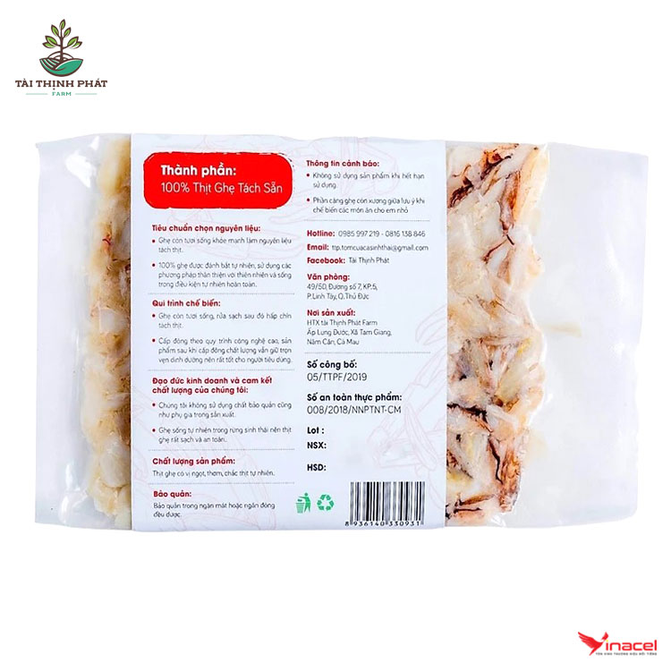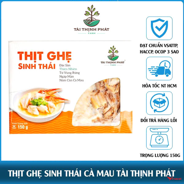 Thịt ghẹ sinh thái Cà Mau Tài Thịnh Phát sử dụng những con ghẹ sống tự nhiên trong rừng ngập mặn Năm Căn Cà Mau. Ghẹ được sản xuất theo quy trình khép kính từ nguyên liệu đến thành phẩm và cam kết không dùng chất bảo quản.
