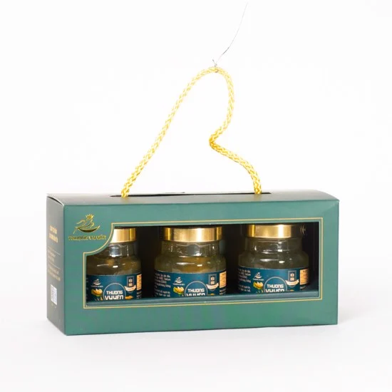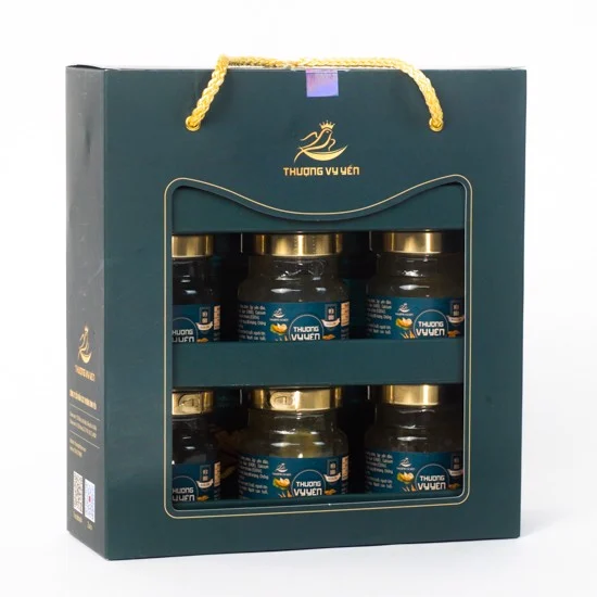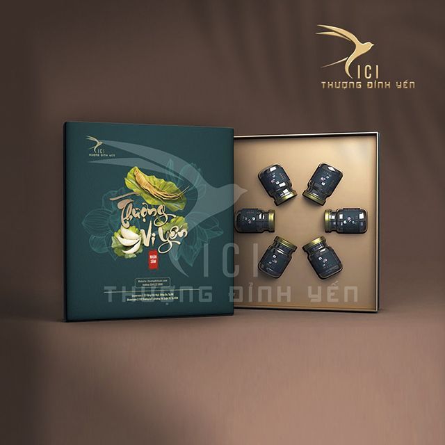 Bộ sản phẩm yến sào thượng vy nhân sâm được đóng trong hũ thuỷ tinh tiệt trùng hút chân không dung tích 80ml, lớp ngoài là hộp giấy (set 6 hũ).