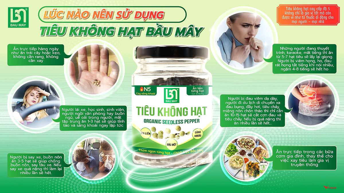 • Bạn sử dụng 3 – 8 hạt Tiêu Không Hạt Bầu Mây: ngậm sau đó nhai giúp Bạn ngay lập tức giảm say tàu xe, đầy hơi, ho, ói, nôn, chướng bụng, đau bụng tiêu chảy, đau dạ dày, lạnh, cảm lạnh, làm ấm bụng, giúp bài tiết độc tố… cải thiện hệ tiêu hóa.