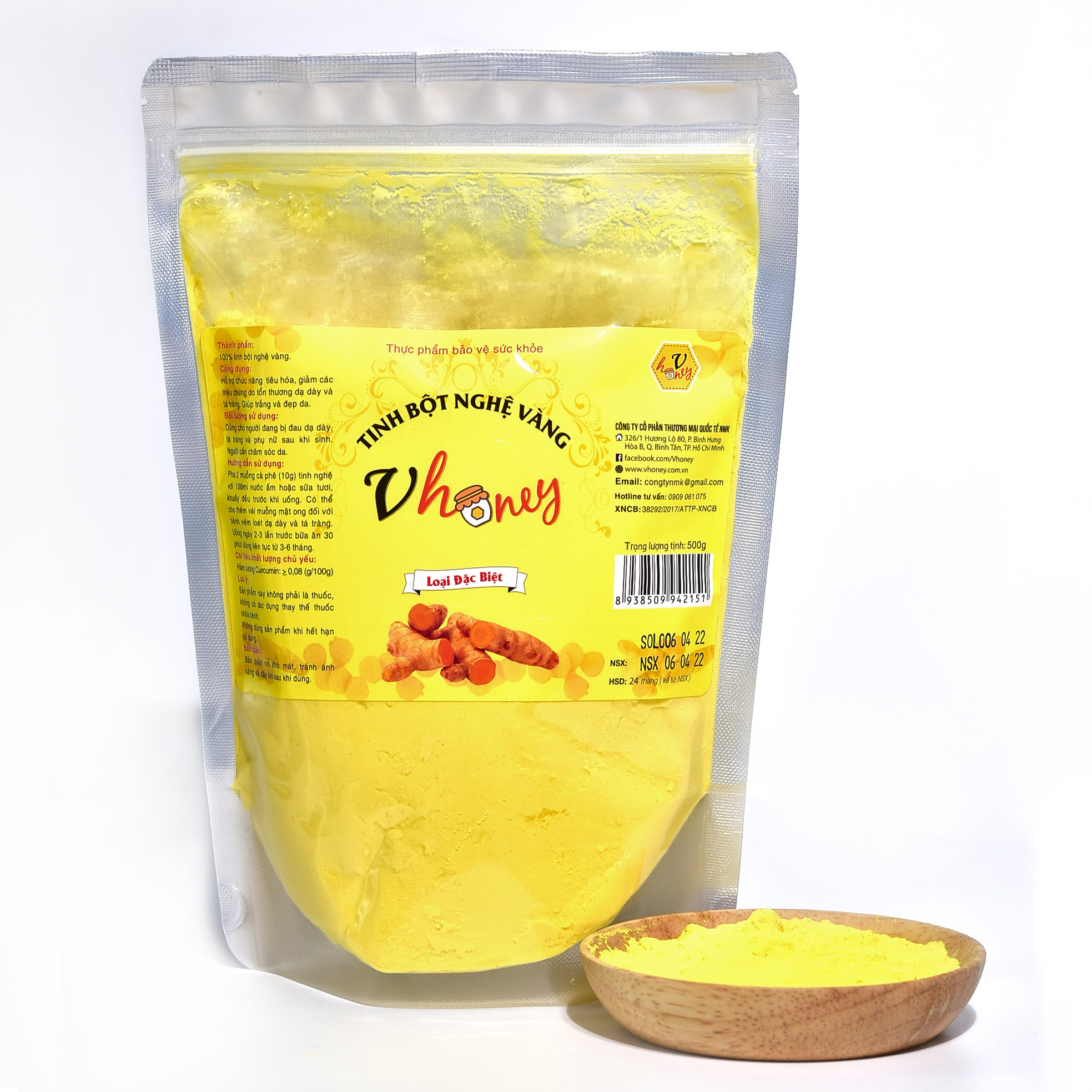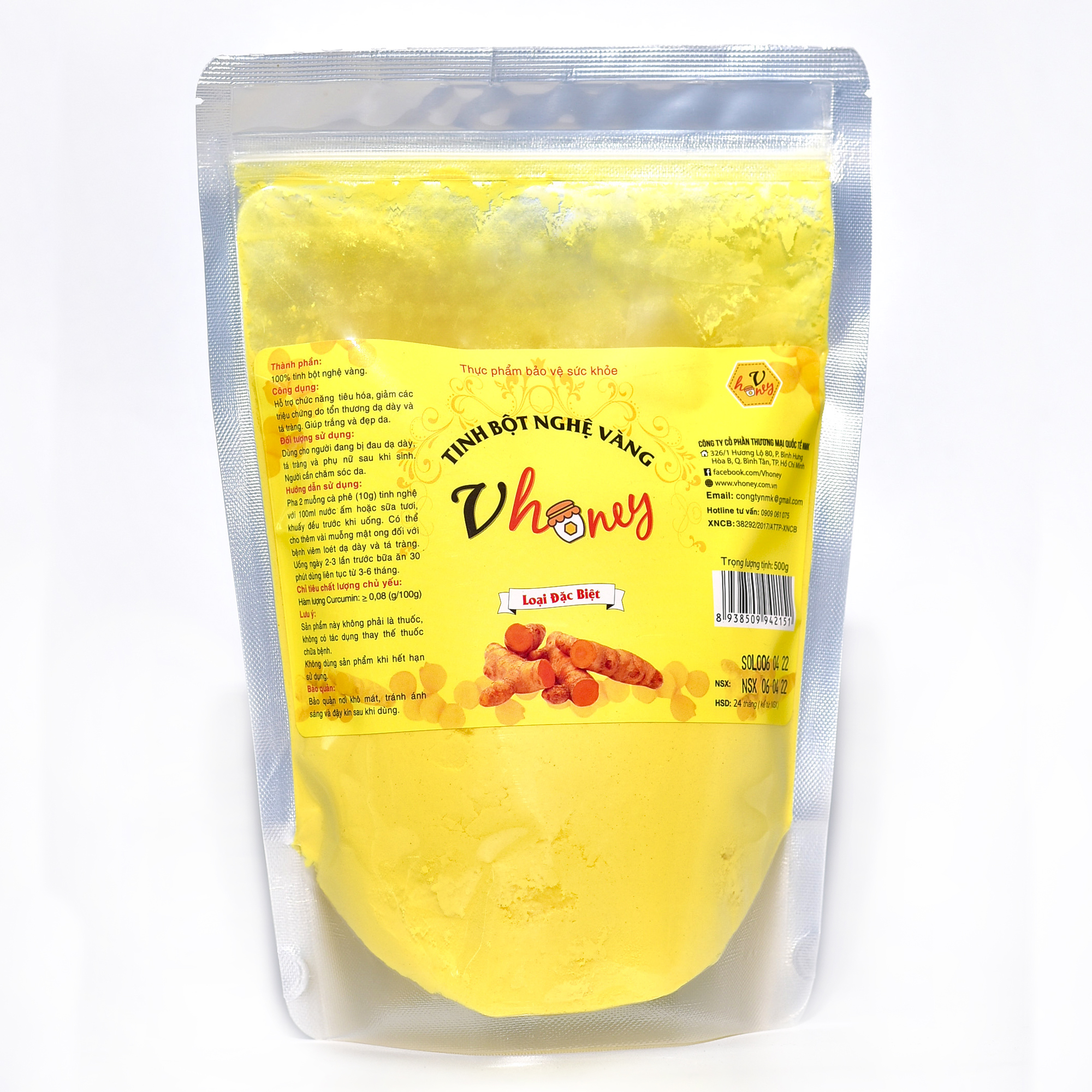 -Tinh bột nghệ Vhoney có màu vàng tươi rất bất mắt bởi đã được lọc bỏ tạp chất như xơ, dầu nghệ, chì ...