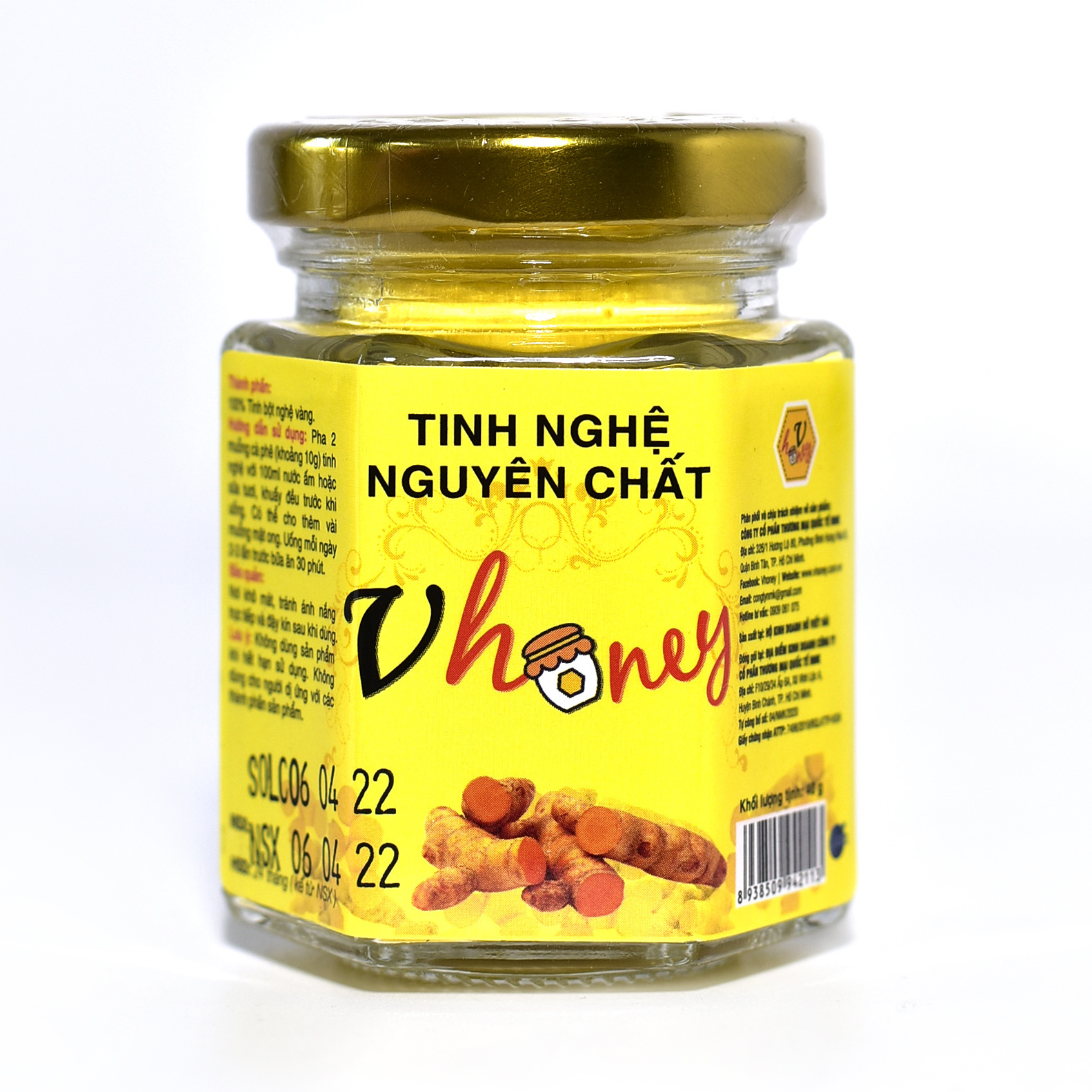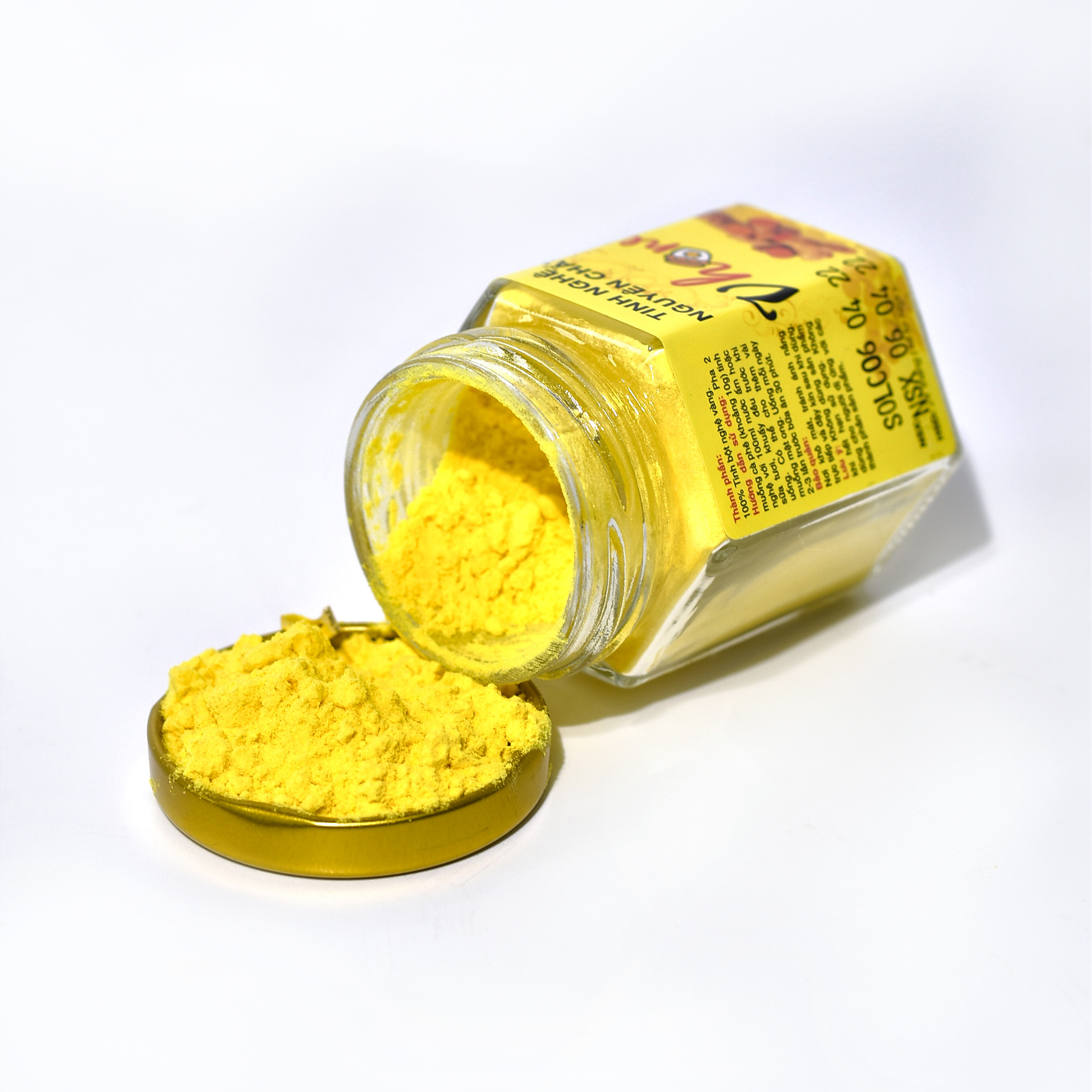 -Tinh bột nghệ Vhoney có màu vàng tươi rất bất mắt bởi đã được lọc bỏ tạp chất như xơ, dầu nghệ, chì ...