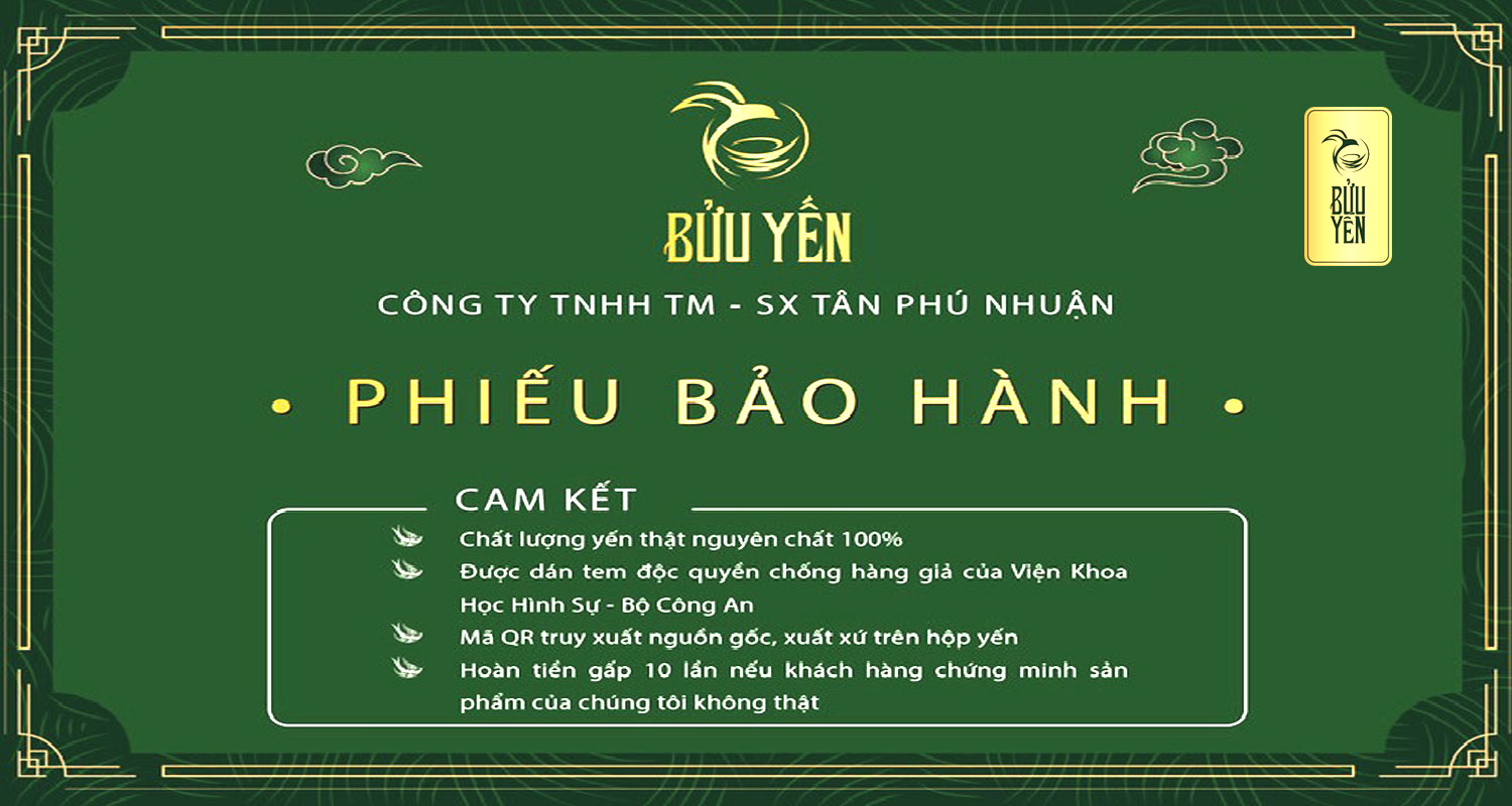 Bửu Yến cam kết 100% sản phẩm yến rút lông nguyên tổ đạt chuẩn nguyên chất. Nếu có bất kỳ phát hiện nào về hàng giả, chúng tôi sẽ hoàn tiền gấp 10 lần giá trị sản phẩm đó.