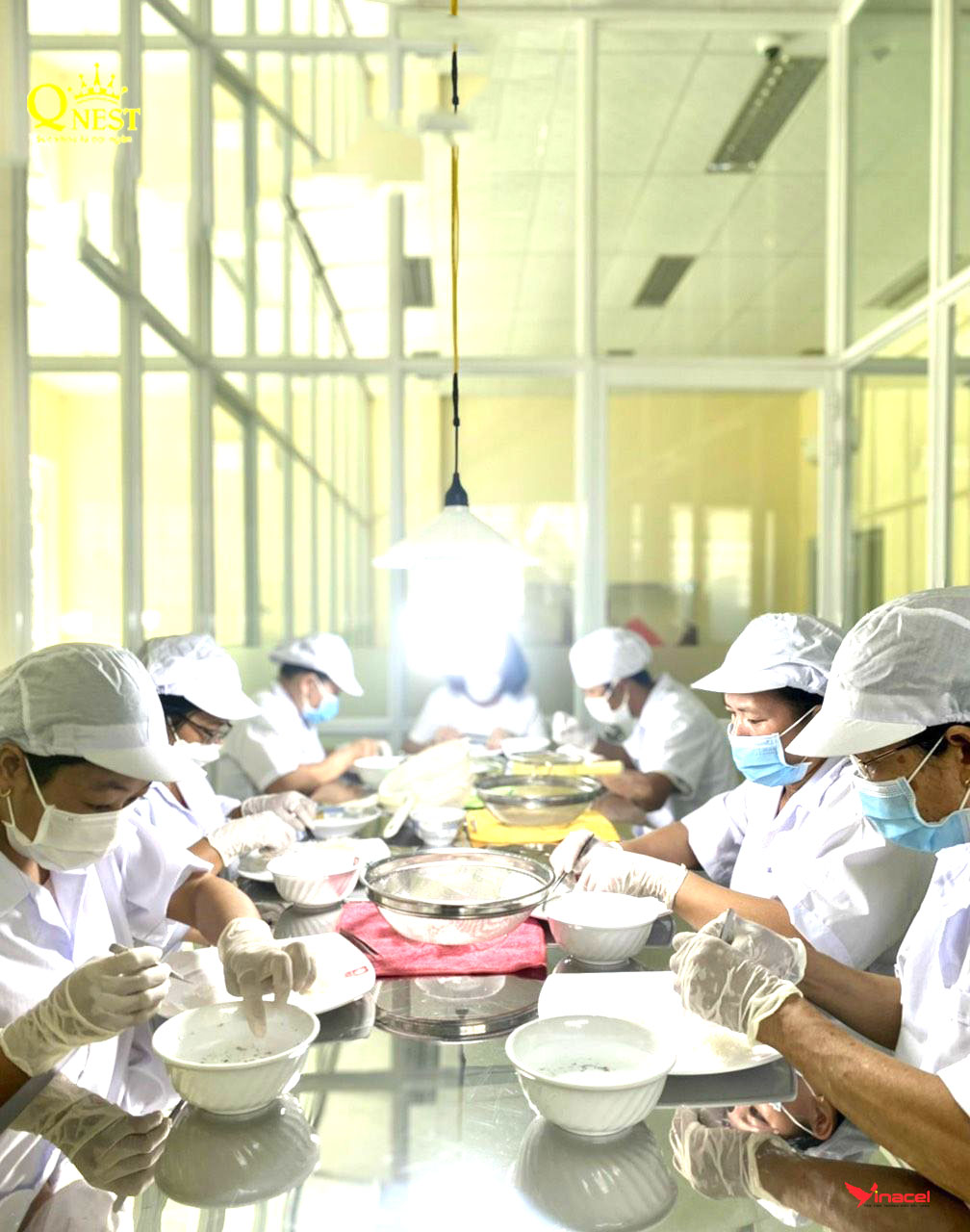 • Bước 3: Sau khi nhặt lần đầu tương đối sạch, khi đó yến sào còn một số lông kim và tạp chất nhỏ khó nhặt. Chúng ta tiến hành gắp từng phần yến để vào ray và đặt 1 tô nước. Dùng muỗng khuấy nhẹ sẽ làm rớt đi những lông kim khó nhặt và hạn chế để tổ yến tiếp xúc nước lâu vì dễ làm mất đi những khoáng chất có trong tổ yến (dùng loại ray có lỗ nhỏ sẽ không làm rớt yến ra). Tiếp tục ta tiến hành làm cho hết phần yến còn lại.