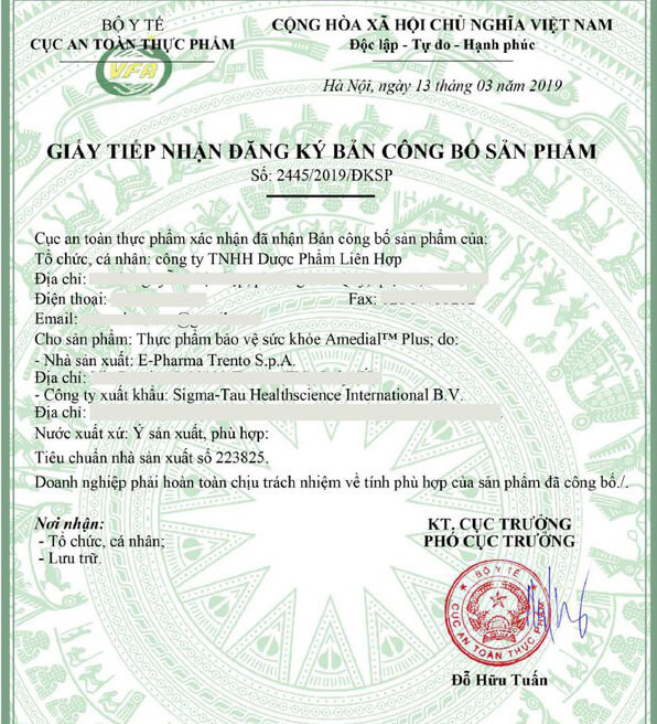 Amedial™ Plus đã được Cục An Toàn Thực Phẩm cấp Giấy tiếp nhận bản đăng ký công bố sản phẩm số 2445/2019/ĐKSP, và Giấy xác nhận nội dung quảng cáo số 00033/2020/ATTP-XNQC. Người mua có thể kiểm tra thật giả thông qua giấy chứng nhận vừa nêu, hoặc quét mã vạch số 8717825970099 và xem tem chống hàng giả được phát hành bởi Bộ Công An.