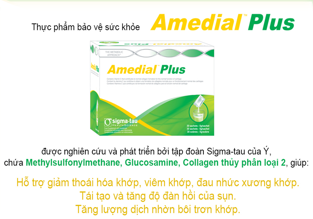 AmedialTM Plus dùng cho người bị thoái hóa khớp, viêm và đau nhức xương khớp, sản phẩm chứa Methylsulfonylmethane, Glucosamine, Collagen thủy phân loại 2 giúp: