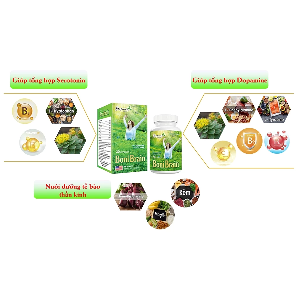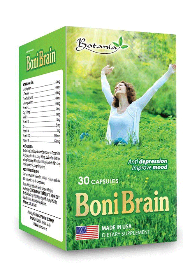 Boni Brain được nghiên cứu và phát triển nhằm mang đến giải pháp an toàn, hiệu quả cho người bị trầm cảm, mất ngủ do căng thẳng, suy nhược thần kinh. Sản phẩm chứa bột cây rễ vàng kết hợp cùng vitamin, acid amin thiết yếu hỗ trợ sản sinh "hormone hạnh phúc" Serotonin và Dopamine. Giúp tinh thần sảng khoái, tràn đầy năng lượng, giảm tình trạng lo âu, căng thẳng, cải thiện giấc ngủ do căng thẳng thần kinh.