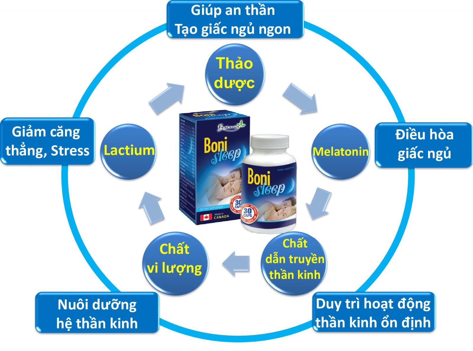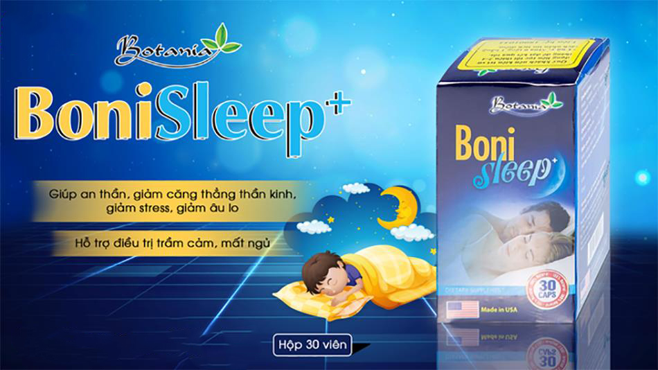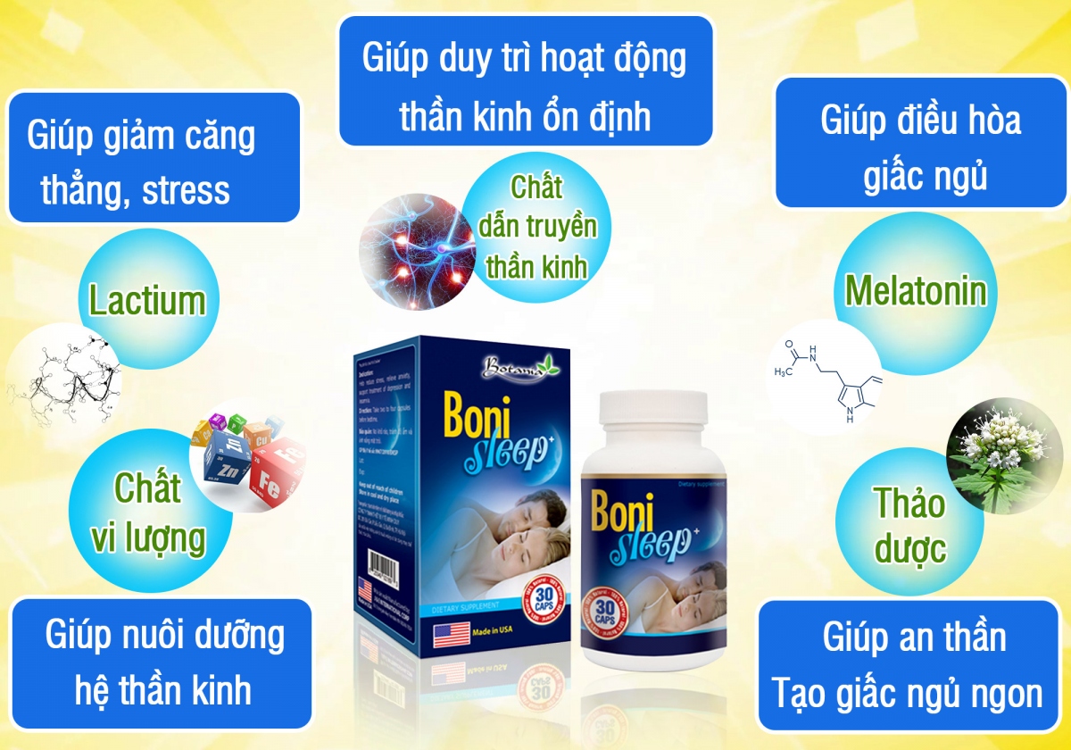 Thực phẩm bảo vệ sức khỏe BoniSleep + hỗ trợ giảm căng thẳng thần kinh, giảm stress, giảm lo âu. Giúp an thần, dễ ngủ, ngủ ngon giấc