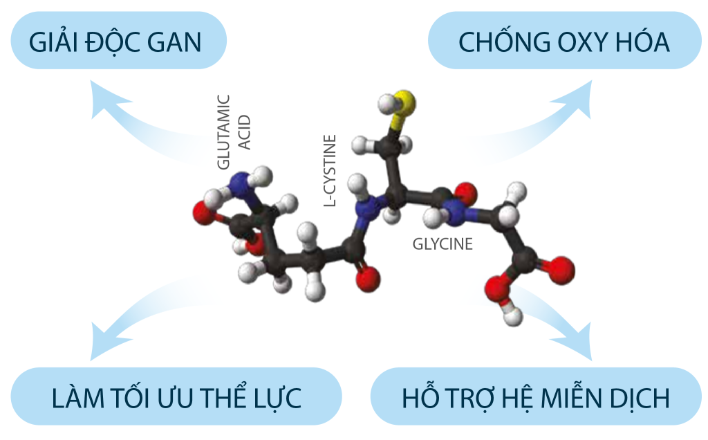 • Glutathione: giúp chống oxy hóa, đào thải các gốc tự do, giúp tế bào khỏi stress oxy hóa. Làm sáng da. Giải độc, tăng cường miễn dịch, tăng cường chức năng gan. Tăng số lượng và chất lượng tinh trùng.