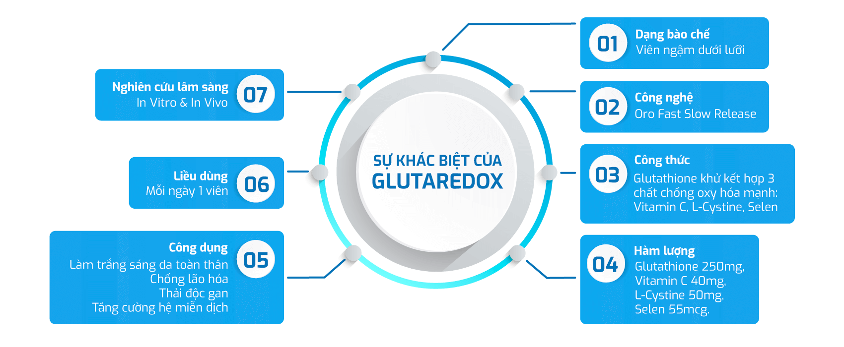 Những thông tin gần đây về Glutaredox cho biết rằng sản phẩm đã được đánh giá cao ở Châu Á, nơi quan tâm rất nhiều vào vấn đề làm sáng da, Glutaredox trong một viên nén ngậm dưới lưỡi đơn giản đã trở nên một chất bổ sung đột phá mang lại hiệu quả tương đương với glutathione tiêm mạch. Công thức được cấp bằng sáng chế của nó với nồng độ cao của Glutathione dạng khử, Vitamin C, Selen và L-Cysteine dùng công nghệ Oro-FS-Release, đảm bảo tỷ lệ hấp thụ 100% cho phép vượt trội so với các loại khác.