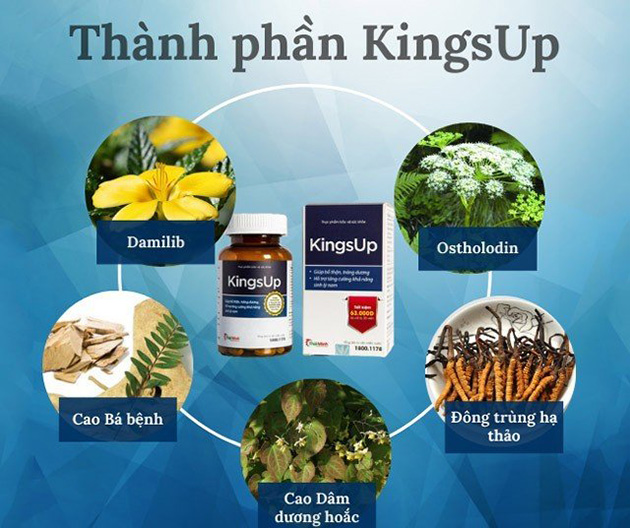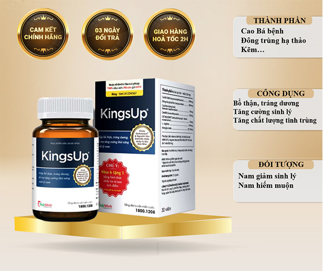 KingsUp là thực phẩm bảo vệ sức khỏe do Công Ty Cổ Phần Công Nghệ Cao Thái Minh sản xuất được kết hợp hoàn toàn từ những thảo dược có nguồn gốc thiên nhiên đảm bảo an toàn với người sử dụng. Sản phẩm được bào chế dưới dạng viên nén, dùng trực tiếp theo đường uống, giúp hỗ trợ trong việc bổ thận.