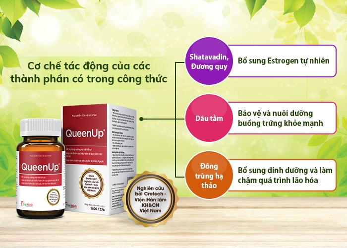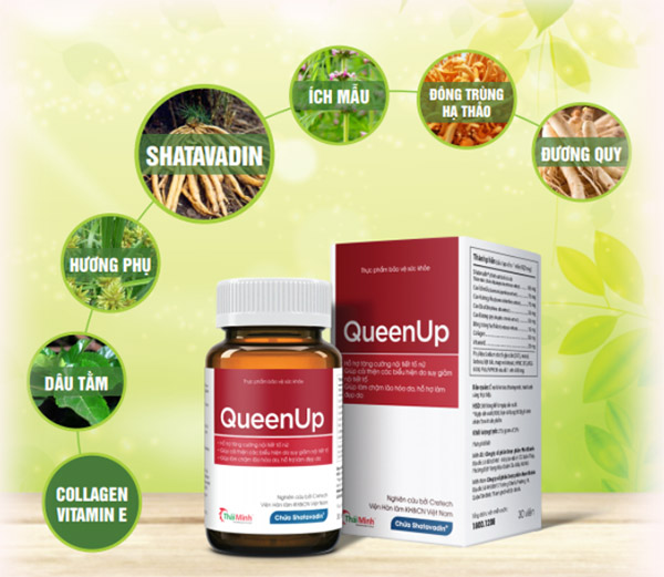 Thực phẩm bảo vệ sức khỏe QueenUp có thành phần chiết xuất Shatavadin từ rễ cây Thiên môn chùm – được nghiên cứu bởi Trung tâm nghiên cứu và chuyển giao công nghệ – Viện Hàn lâm Khoa học và Công nghệ Việt Nam sẽ là giải pháp giúp hỗ trợ tăng cường nội tiết tố nữ, từ đó sẽ hỗ trợ cải thiện các vấn đề bạn đang gặp phải.