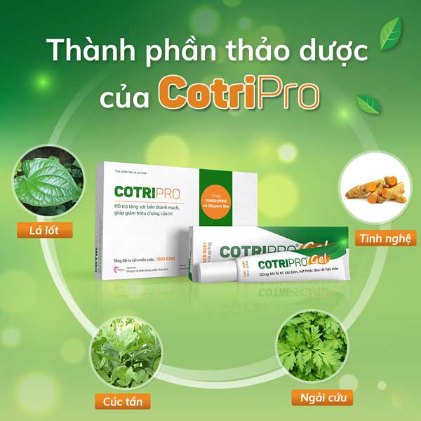 - Viên uống Cotripro được làm từ các loại thảo dược thiên nhiên, lành tính, giúp ngăn chặn các mầm mống gây bệnh từ bên trong, điều hòa và giải độc cơ thể. Cụ thể, Cotripro chứa thành phần như Diếp cá, Cúc tần, Đương quy,….giúp tăng độ bền của các mao mạch ở vùng hậu môn, hỗ trợ cầm máu và giảm đau rát khi đi đại tiện và tinh chất từ Lá lốt và Nghệ giúp hỗ trợ điều trị chứng táo bón, sát khuẩn từ bên trong, người dùng sau khi sử dụng sẽ dễ đi đại tiện hơn.