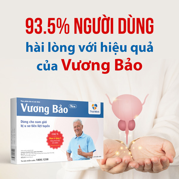 Thực phẩm bảo vệ sức khỏe Vương Bảo hỗ trợ giảm nguy cơ và hạn chế sự phát triển của u phì đại tiền liệt tuyến, cải thiện những rối loạn tiểu tiện ở nam giới có u xơ tiền liệt tuyến. Sản phẩm đã có mặt trên 10 năm trên thị trường và nhận được sự tin tưởng của người dùng trên cả nước bởi những hiệu quả mà sản phẩm đem lại.