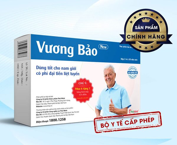 Vương Bảo là sản phẩm thuộc nhóm Thực phẩm bảo vệ sức khỏe được Bộ Y tế chứng nhận đủ điều kiện an toàn thực phẩm và cấp phép lưu hành với số đăng ký là 12422/2019/ĐKSP. Do vậy, khách hàng có thể yên tâm sử dụng sản phẩm để hỗ trợ cải thiện những vấn đề về phì đại tiền liệt tuyến.