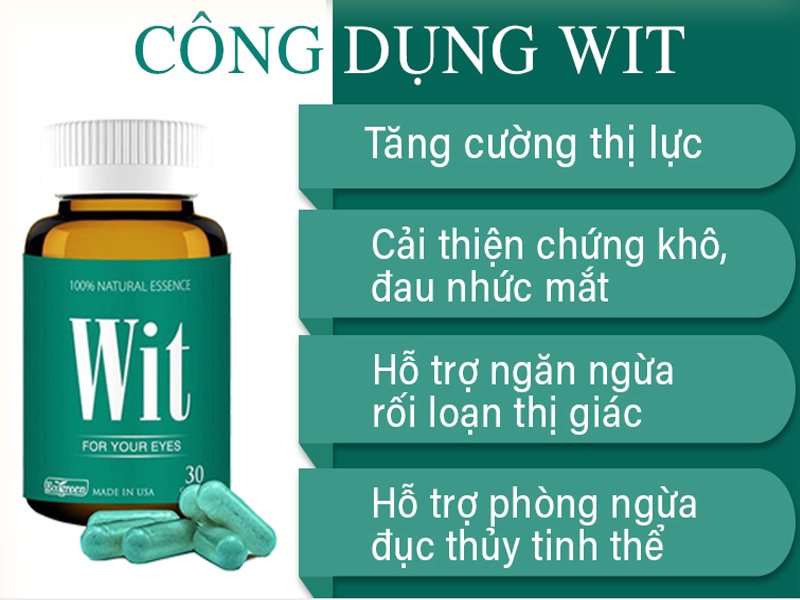 Đôi mắt là bộ phận rất quan trọng của cơ thể. Tuy nhiên, không phải ai cũng biết cách chăm sóc và bảo vệ đôi mắt thế nào cho hợp lý. Khi tuổi càng cao, môi trường càng ô nhiễm, ánh sáng mặt trời, ánh sáng từ các thiết bị điện tử,…là nguyên nhân khiến đôi mắt ngày càng suy yếu. Sử dụng viên bổ mắt Wit là giải pháp bổ sung các chất dinh dưỡng tốt cho mắt qua đường ăn uống nhằm cung cấp các hoạt chất quan trọng giúp hạn chế tác động của các chất có hại đến mắt. Từ đó hỗ trợ ngăn ngừa các bệnh về mắt và bảo vệ mắt, làm chậm quá trình lão hóa mắt.