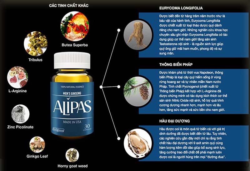 • Alipas mới còn có một thành phần quan trọng khác tinh chất hàu đại dương vốn rất giàu kẽm và axit amin, giúp cơ thể nam giới tăng các dưỡng chất, luôn ở trong trạng thái sung mãn, dồi dào sinh lực.