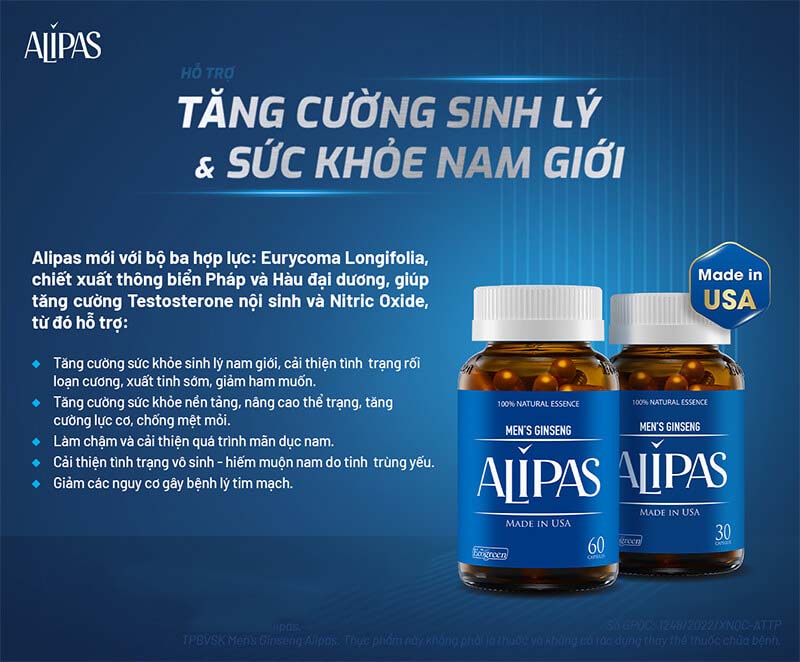 Alipas mới là sản phẩm nâng cấp toàn diện hơn từ sản phẩm Alipas Platinum. Sản phẩm Sâm Alipas New là phát minh mới của các nhà khoa học Mỹ, kết hợp giữa tinh chất và các loại thảo dược dành riêng cho phái mạnh giúp làm tăng khả năng sinh lý và sức khỏe toàn thân của nam giới.