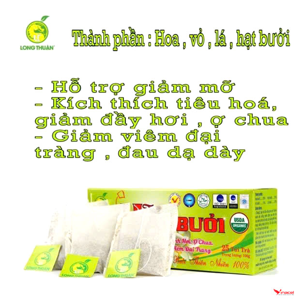 Trà Hoa Bưởi Long Thuận không những có tác dụng làm đẹp, thanh lọc cơ thể mà còn có tác dụng tăng cường tiêu hóa rất hiệu quả. Bớt chút thời gian để thực hiện, bạn sẽ có được một thức uống có rất nhiều công dụng rất tiết kiệm mà lại vô cùng hiệu quả. Trị viêm đại tràng, đau dạ dày, nhuận tràng, giảm đường huyết, giảm cân, giảm say rượu.