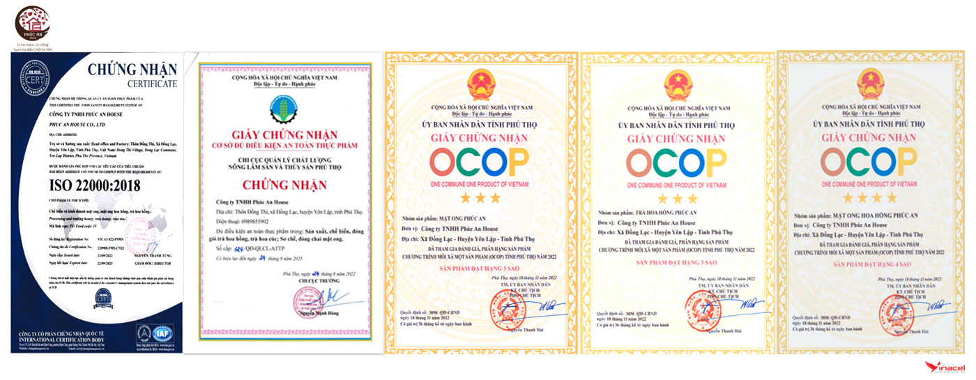Trà hoa hồng Phúc An được tuyển chọn từ những nụ hồng tự nhiên theo hướng hữu cơ, không phân bón hóa học. Sau đó được sấy lạnh trong thời gian 40 -60 tiếng giúp hương hoa hồng được giữ nguyên từng cánh trà. Sản phẩm được UBND tỉnh Phú Thọ cấp giấy chứng nhận OCOP 3 sao năm 2022.