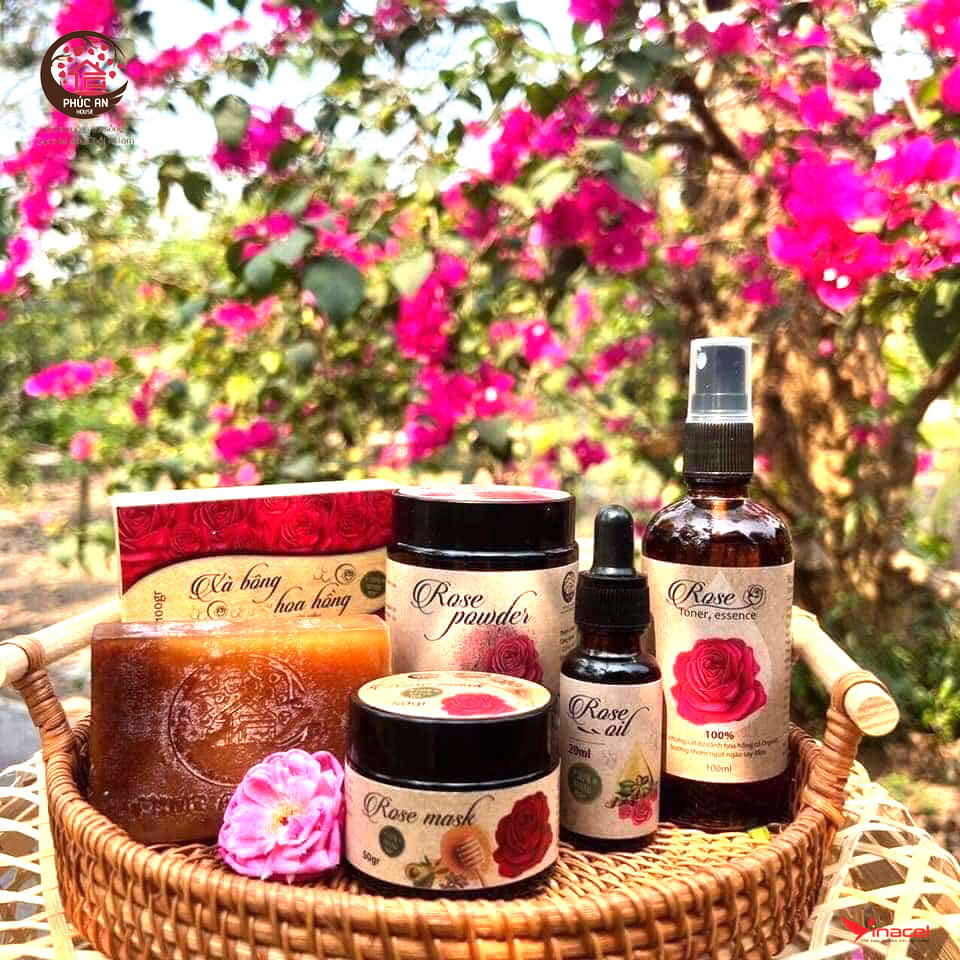 • Các sản phẩm tại Phúc An House hiện có gồm các sản phẩm chăm sóc da mặt, chăm sóc da toàn thân, chăm sóc tóc, và trà hoa hồng