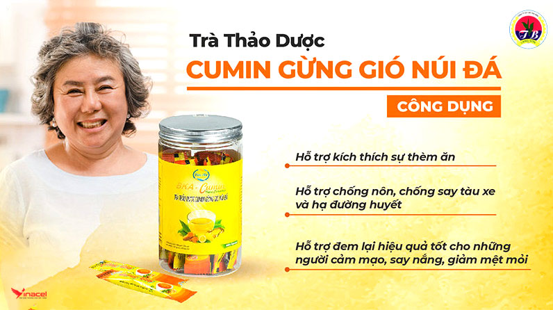 Trà Thảo Dược Cumin Gừng Gió Núi Đá chứa 3 loại thành phần chính là gừng gió, nano curcumin từ nghệ vàng và đường kính, chuyên hỗ trợ tăng cường chức năng tiêu hóa, rất phù hợp cho người hay bị khó tiêu, thường bị đau lạnh bụng.