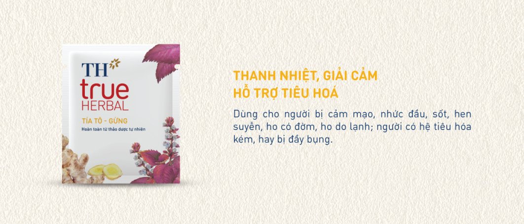 Trà thảo dược TH true HERBAL Tía tô - Gừng từ những thành phần rất gần gũi hàng ngày, phù hợp với người bị nhức đầu, sốt, hen suyễn, ho có đờm, ho do lạnh. Ngoài ra, nhờ có gừng, sản phẩm cũng phù hợp với điều kiện thời tiết ở nước ta là một nước khí hậu gió mùa khắc nghiệt.