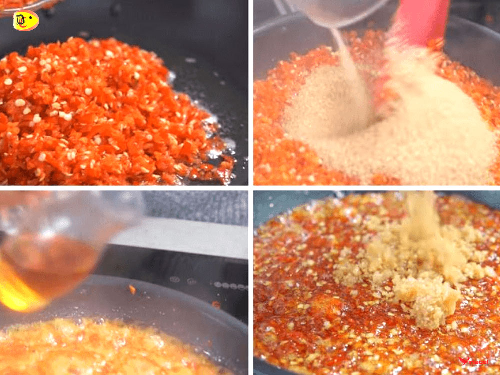 • Bước 4: Bắc chảo nóng, rót vào 2 muỗng canh dầu ăn, cho 15gr tỏi băm vào phi thơm. Sau đó cho hết số ớt vừa xay vào. Thêm 150gr đường, 2 muỗng cà phê muối rồi đảo đều tay cho đường tan hết.