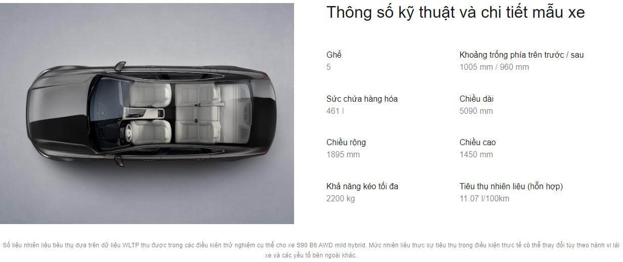 Nằm trong phân khúc xe sang chính vì thế kích thước của mẫu sedan này cũng không hề nhỏ bé. Volvo S90 có thông số kỹ thuật lần lượt Dài x Rộng x Cao lần lượt là: 5.090 x 1.903 x 1.450 (mm). Với kích thước, chắc chắn không gian bên trong xe chắc chắn sẽ mang lại ấn tượng lớn về độ rộng rãi cho người ngồi.
