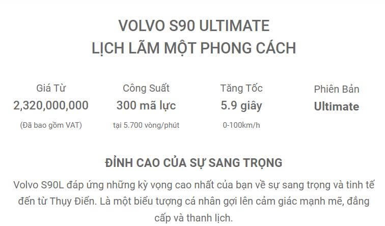 Phiên bản lần này có một số thay đổi hiện đại hơn, tích hợp công nghệ hơn và đương nhiên là vẫn là phiên bản với trục cơ sở dài nhất đem đến không gian sang trọng, thời thượng vốn rất nổi tiếng của Volvo S90. Mẫu xe Volvo S90 lần này được trang bị tất cả những công nghệ tối tân, hiện đại nhất do đó tên gọi sẽ là Volvo S90 Ultimate.