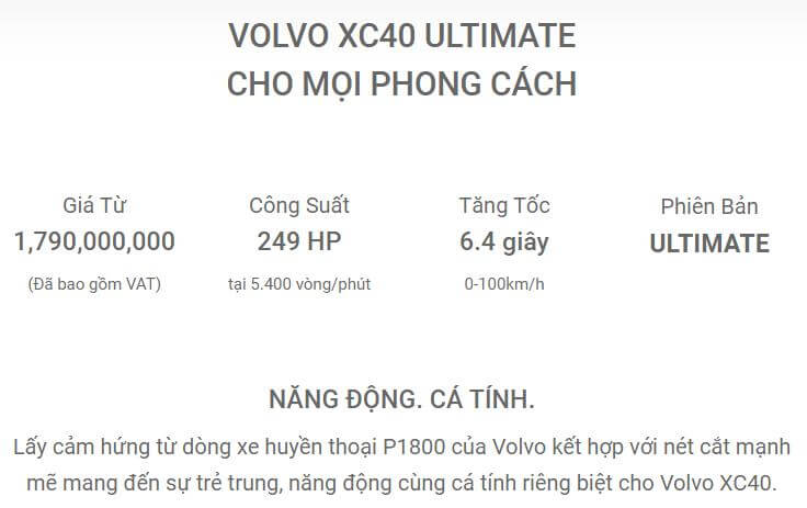 Dù là em út trong gia đình SUV của Volvo thế nhưng Volvo XC40 vẫn không hề kém cạnh. Đàn anh khi mẫu xe này luôn được người dùng tin cậy cũng như đạt được hàng loạt giải thưởng. Volvo XC40 Ultimate là một trong các mẫu SUV gầm cao cỡ nhỏ ấn tượng nhất mà phân khúc đang sở hữu tại thị trường Việt Nam. Có thiết kế mạnh mẽ, trẻ trung, XC40 không chỉ là sự lựa chọn hoàn hảo cho đấng mày râu mà cũng rất được khách hàng nữ yêu thích với sự cơ động và tính năng an toàn cực cao giúp cho việc lái xe trở nên đơn giản và an toàn hơn bao giờ hết.