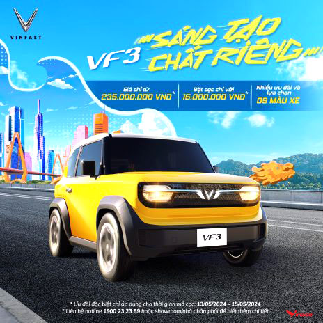Vượt lên trên một phương tiện di chuyển thông thường, VinFast VF 3 là biểu tượng mới mang tính cách mạng trong cuộc sống đô thị. Với thiết kế hiện đại, hiệu suất vận hành linh hoạt, tính năng an toàn tiên tiến, cùng chi phí vận hành siêu rẻ, VF 3 sẽ mở ra một cách tiếp cận hoàn toàn mới trong việc lựa chọn phương tiện di chuyển hàng ngày, mang lại sự thuận tiện, dễ dàng và đặc biệt thoải mái cho tất cả mọi người.