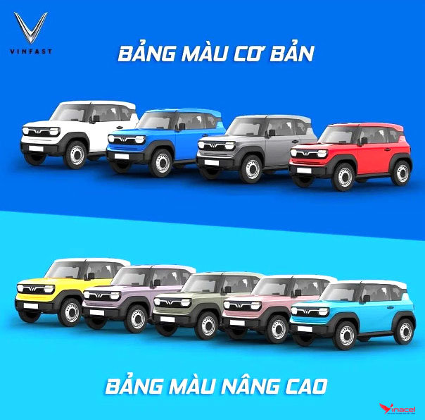 Không chỉ sở hữu kiểu dáng mini nhỏ gọn và giá bán thấp nhất thị trường hiện nay, VinFast VF 3 còn hút hồn người tiêu dùng bằng hệ thống 9 màu ngoại thất trẻ trung, mới mẻ. Cụ thể, dòng xe VF 3 cung cấp 4 lựa chọn màu ngoại thất cơ bản là xanh, trắng, đỏ và xám, cùng 5 lựa chọn màu ngoại thất nâng cao là vàng nóc trắng, xanh lá, hồng tím, xanh dương nhạt nóc trắng và hồng phấn nóc trắng.