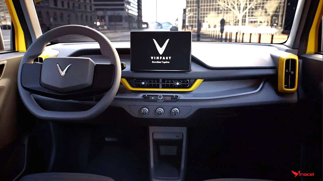 Ở nội thất, VinFast VF 3 giống các đàn anh khi lược bỏ hầu hết các nút bấm vật lý. Vô-lăng đơn giản, màn hình giải trí cảm ứng 10 inch ở trung tâm táp-lô là nơi điều khiển các tính năng trên xe. Vì chiều dài hạn chế, VF 3 chỉ có hai cửa bên hông và một phía sau. Xe có cấu hình 4 chỗ.