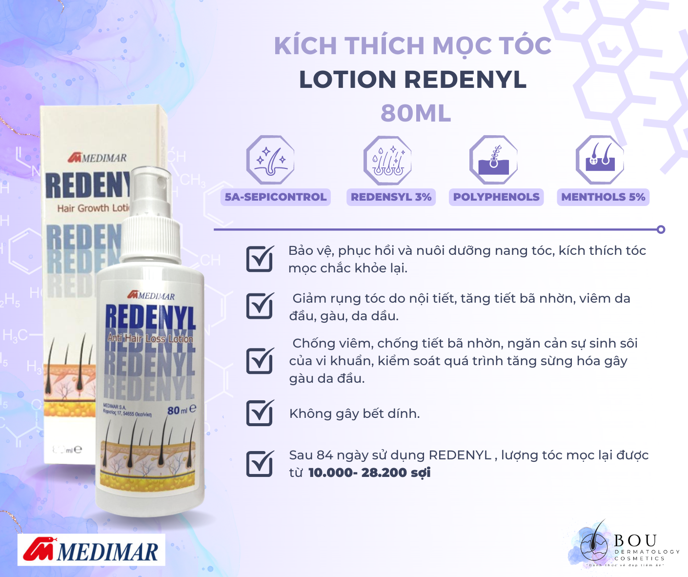 • Redenyl Lotion đã được nghiên cứu kỹ lưỡng, và chứng minh được hiệu quả cao trong việc cải thiện tình trạng rụng tóc.